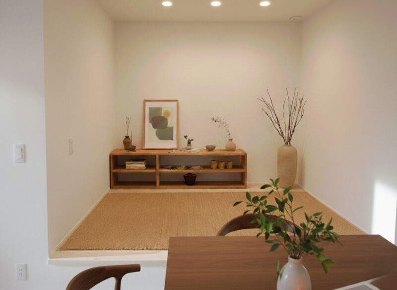 リビングの一角に設けられた畳の小上がりは、家族が自然と集まる「癒しの場所」。