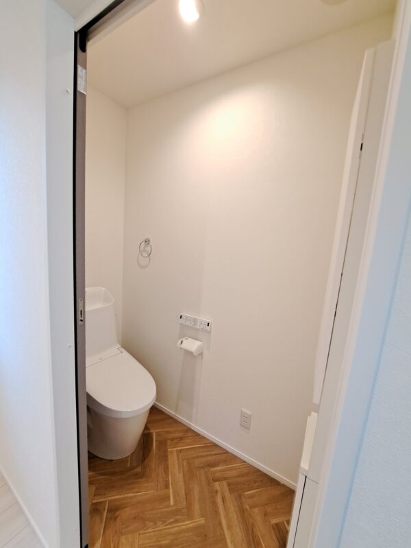 空間に入った瞬間、目を引くヘリンボーン柄の床が、毎日使う場所にさりげない遊び心をプラス。シンプルな中にもデザイン性を感じられ、清潔感とおしゃれさを両立した、気分が上がるトイレ空間です。