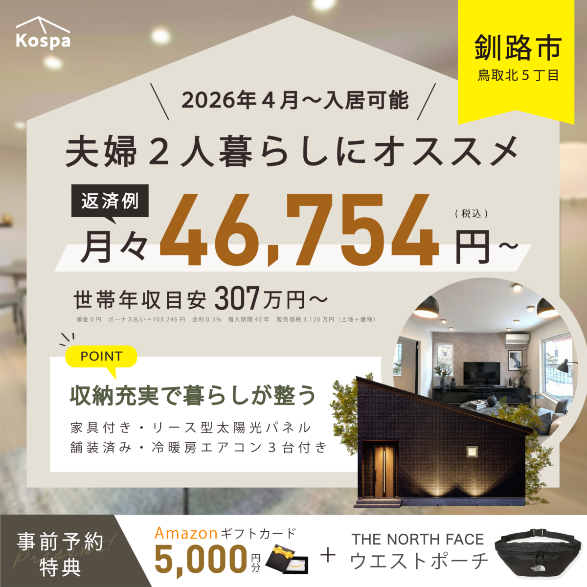 【釧路市鳥取北】1棟限定!コンパクトなのに収納が充実した2LDK平屋モデルハウスを先行販売します!!