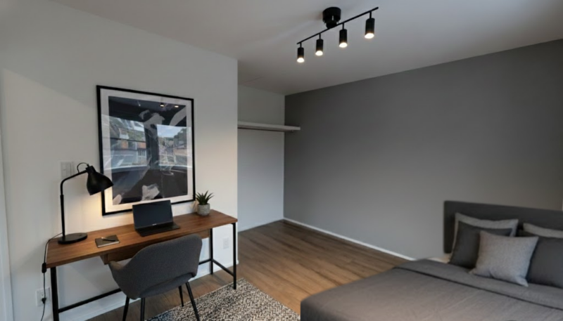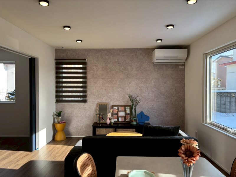やわらかなグレーのアクセントウォールが印象的なリビング。落ち着いたトーンが空間全体を包み込み、ゆったりとくつろげる雰囲気に。シンプルな家具とも相性がよく、自分好みのコーディネートを楽しめます。