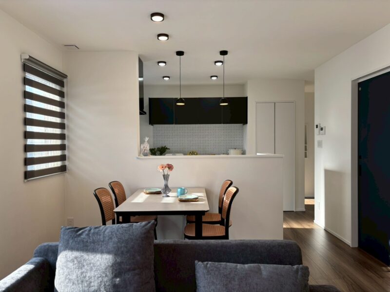 ダイニングには大きな窓を設け、自然光がたっぷり入る明るい空間に。朝食の時間も家族との団らんも、やわらかな光に包まれて過ごせます。季節の移ろいを感じながら、日常が少し特別になる場所です。