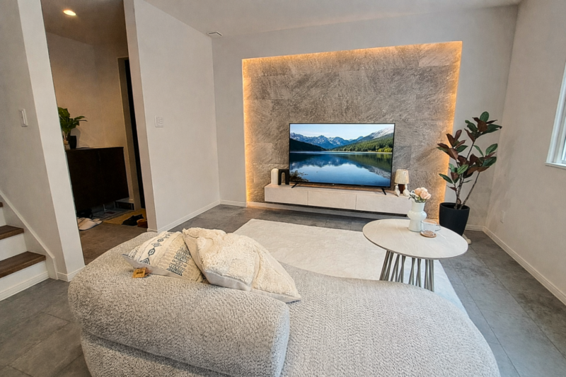 やわらかな光に包まれた広々リビングで、家族がゆったりとくつろぐ時間を楽しめます。